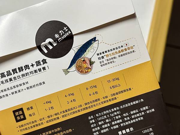 內含:羊肉、鮪魚、雞肝、馬鈴薯、甘藍、蘑菇、魚油、蘋果纖維